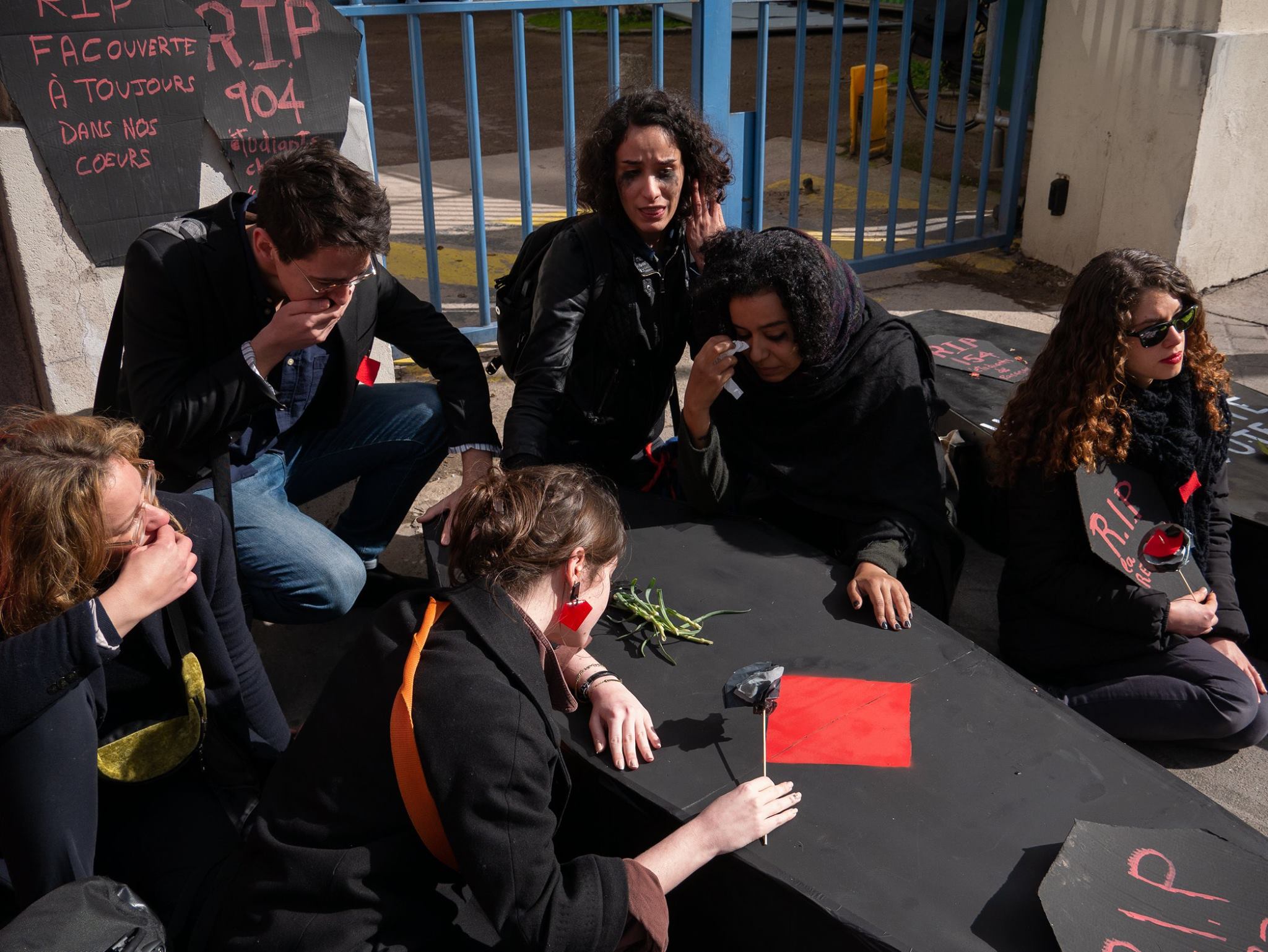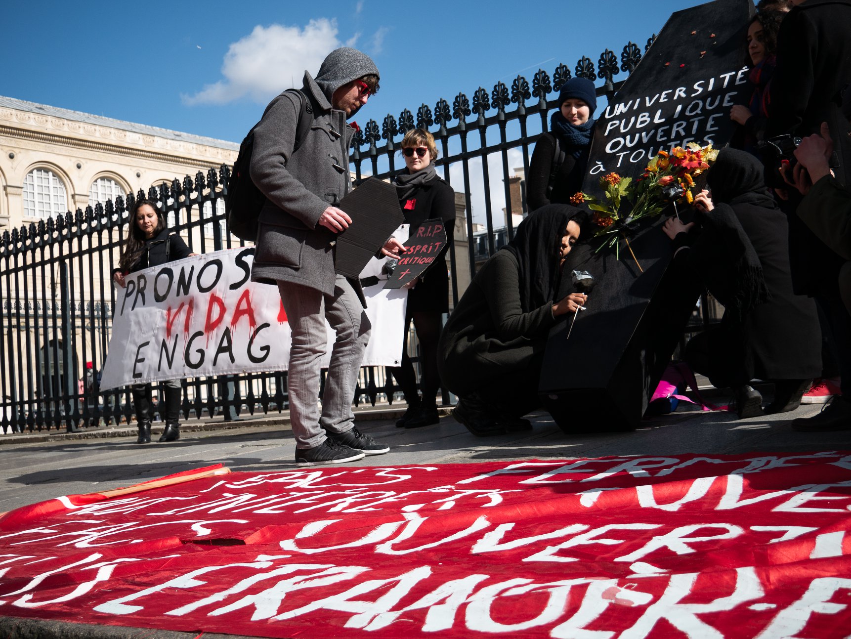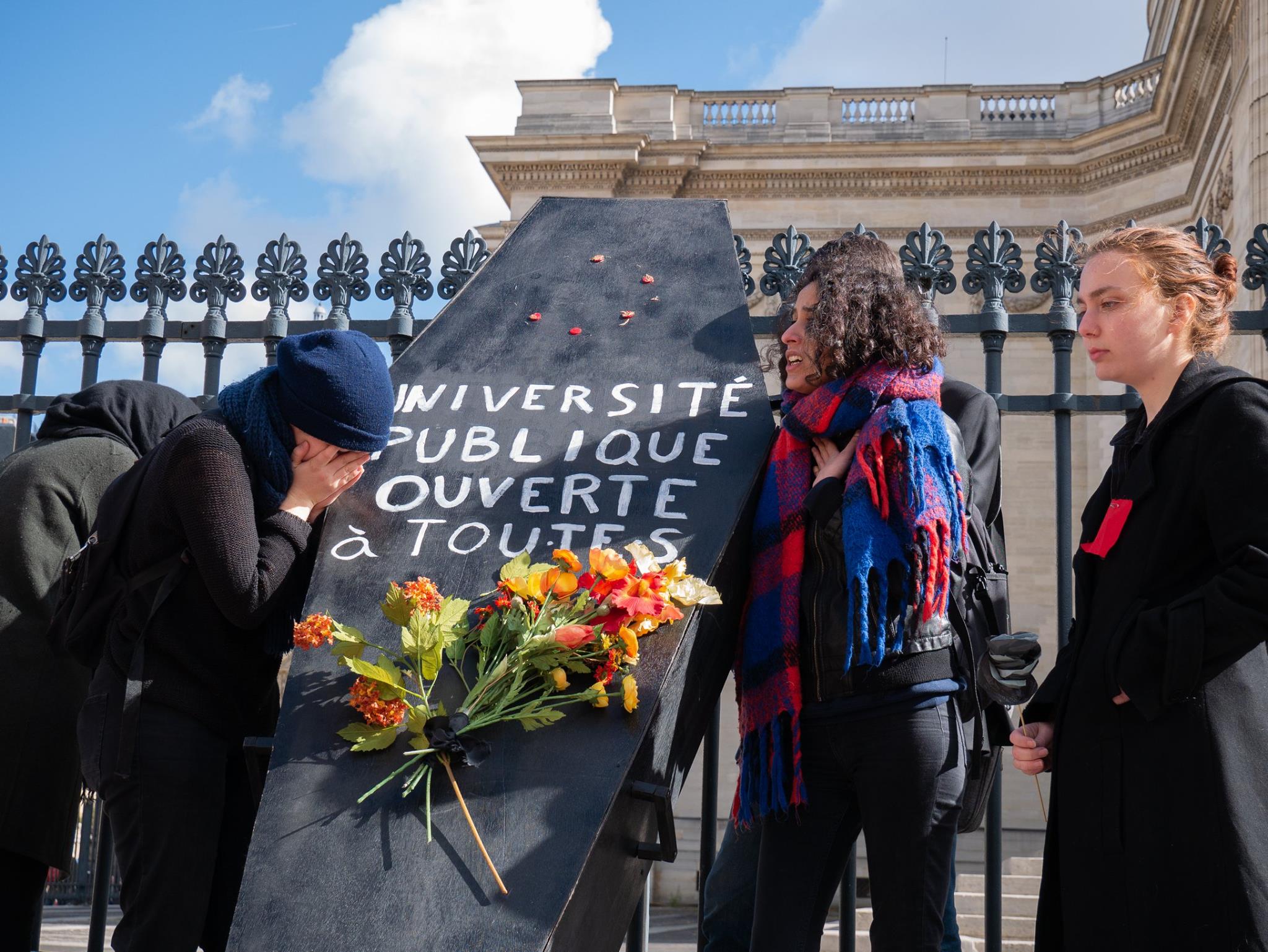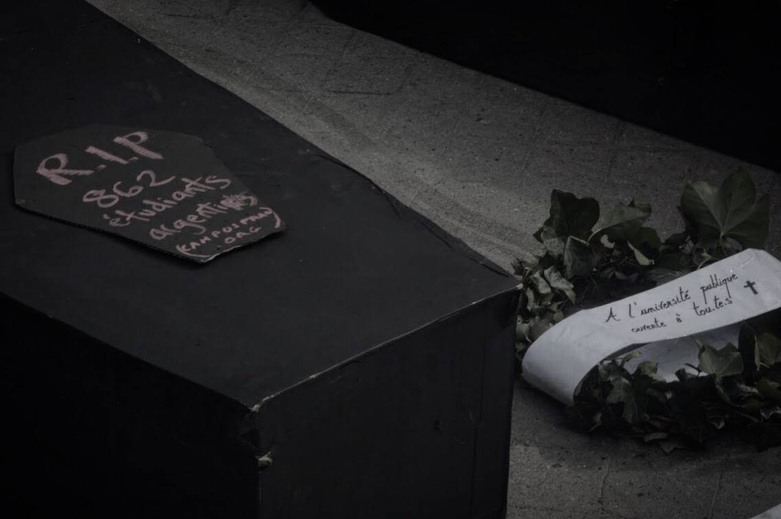 « En ce lundi 11 mars, nous sommes réuni·es pour rendre un dernier hommage à l’enseignement supérieur public. Il aura permis à nombre d’entre nous de nous émanciper, d’acquérir et de construire des connaissances, de nous insérer dans la société tout en œuvrant à des transformations sociales et écologiques. Mais ce n’est plus d’actualité. L’Heure est à l’insertion professionnelle rapide et performante, aux compétences directement opérationnelles dans des emplois qui ne remettent pas en cause l’ordre social ni le fonctionnement ploutocratique des entreprises. En route vers les 3 à 5 ° de réchauffement climatique !