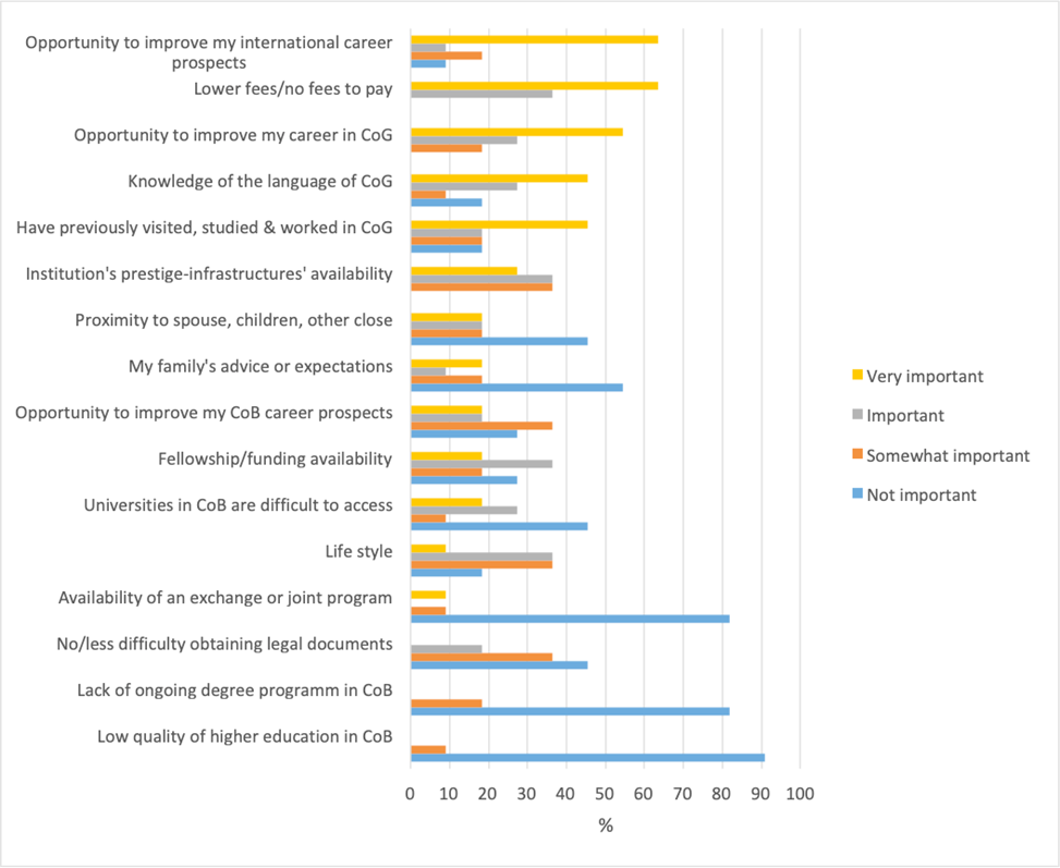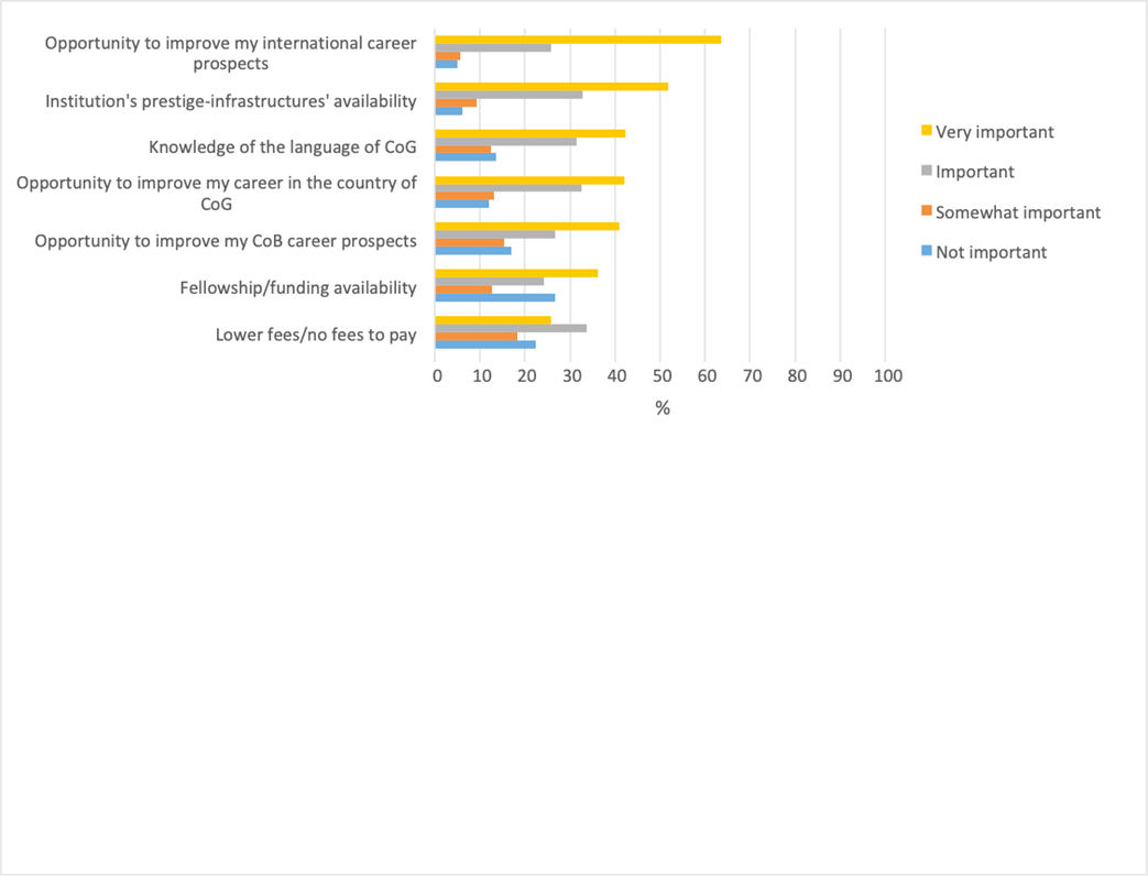 Les principaux motifs de la poursuite d’études en France déclarés par les étudiant·es africain·es sont sensiblement les mêmes que ceux de l’ensemble des étudiant·es internationales·aux interrogé·es : valeur du diplôme français pour accéder au marché du travail à l’international, dans le pays d’origine ou en France, ainsi que la réputation des établissements d’enseignement supérieur. Viennent ensuite la connaissance du français et les possibilités de financement.