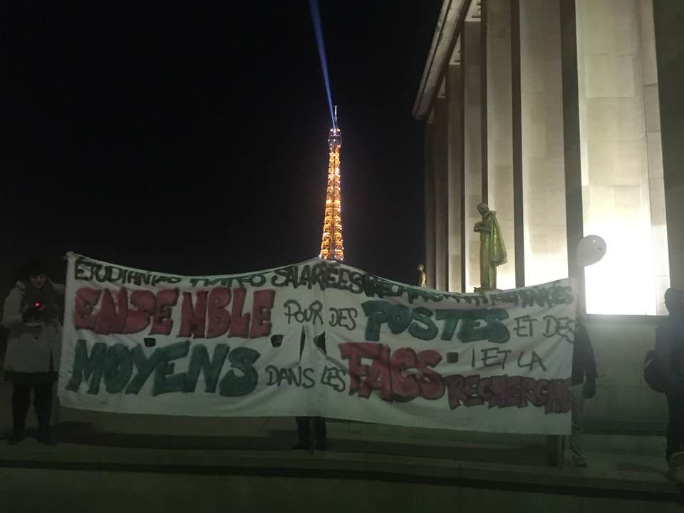 À l’appel du collectif « Facs et labos en lutte », il était prévu d’assister aux vœux de la ministre de l’Enseignement Supérieur et de la Recherche (ESR), Mme Vidal, qui se tenaient au Musée de l’Homme, au cœur des beaux quartiers parisiens. Le soir même, 200 personnels administratifs et de bibliothèques, enseignants⋅es et étudiants⋅es étaient rassemblé·es sur l’esplanade du Trocadéro, pour faire entendre notre colère à la ministre, et lui lire nos vœux pour une université qui émancipe au lieu de soumettre, ouverte à tous⋅tes et fermée aux intérêts privés, et qui traite dignement ses travailleurs⋅ses. Malheureusement, l’entrée au lieu nous était interdite par plusieurs dizaines de gendarmes et policiers, déterminés à protéger la soirée de toute incursion de simples travailleurs⋅ses de l’ESR.