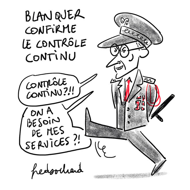 Maintenant, pour pouvoir suivre des cours en ligne il faut : remplir une attestation en précisant ses numéros d’étudiant·es et de carte d’identité ou de carte de séjour, présenter ses empreintes digitales, ses horaires de cours et le nom du prof. Pendant les cours, si les étudiant·es vont sur Facebook, Twitter ou SnapChat plus de 5 min, iels reçoivent d’abord un premier mail d’avertissement signé par Vidal, puis ensuite ça passe à Lallement. Au bout de la troisième fois, iels sont privé·es de sortie jogging pour une semaine.