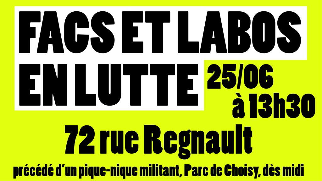 Le jeudi 25 juin nous nous retrouverons devant le 72 rue Regnault, pendant que le projet de LPPR sera examiné par le CTMESRI. Pour l’occasion, nous avons composé deux nouveaux chants de lutte !