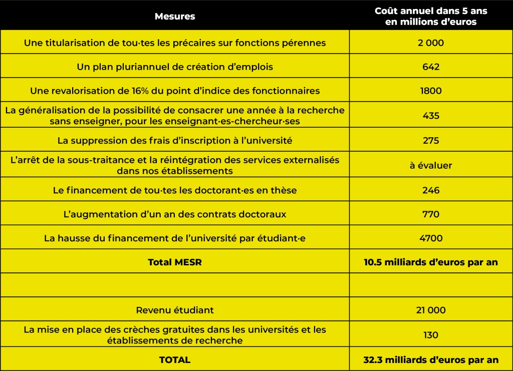 Sur la base de ces revendications portées par les organisations syndicales et les travaux d’une commission du comité de mobilisation, qui s’est réunie lors des coordinations nationales de la recherche de février et mars 2020, voici les différents éléments de chiffrage à même de constituer la base d’un véritable projet alternatif.
