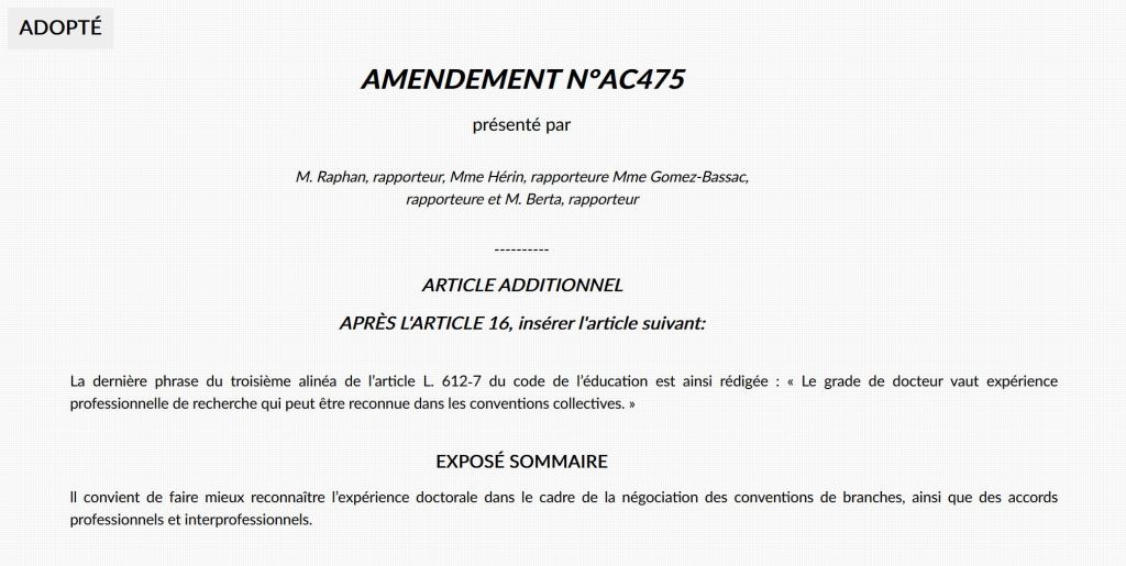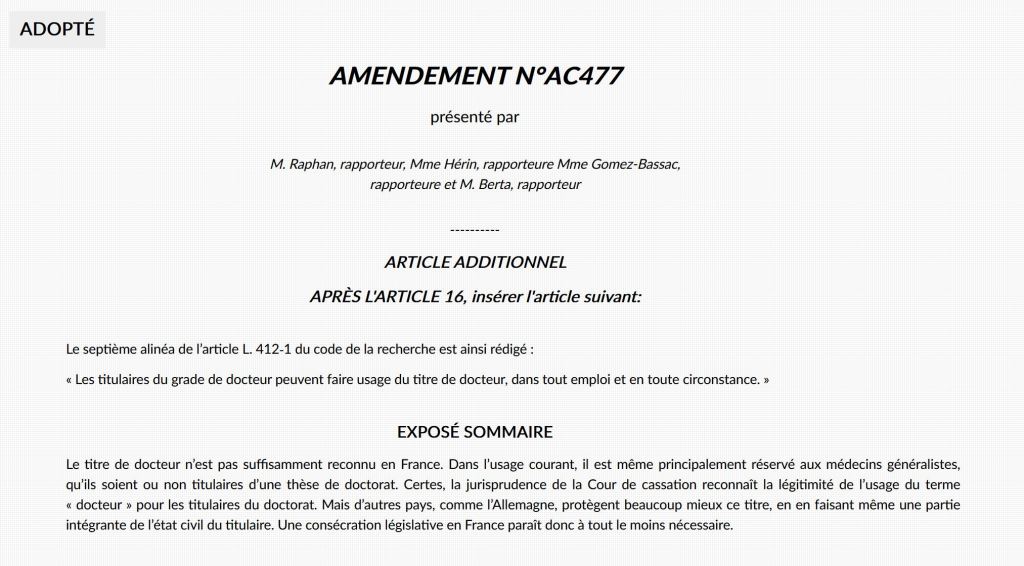 Cet amendement prépare donc le terrain pour que, demain, dans la plus grande confusion, puissent se prévaloir légalement du titre de docteur·e des personnes ayant effectué une thèse de recherche et d’autres ayant fait valoir une expérience, ou payé à prix d’or un diplôme privé. Bien sûr, c’est la recherche scientifique et celleux qui la font qui sortent perdantes.