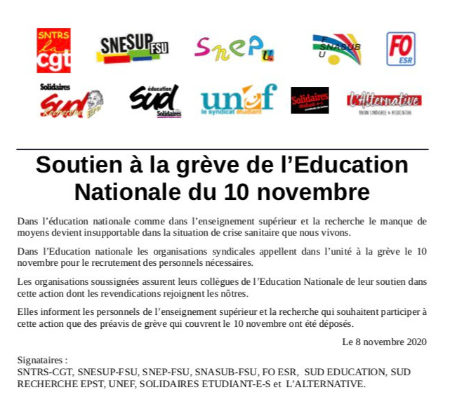 - Les collègues et camarades de Strasbourg appellent également à faire grève aux côtés du primaire et du secondaire. L’intersyndicale de l’ESR nationale nous soutient !