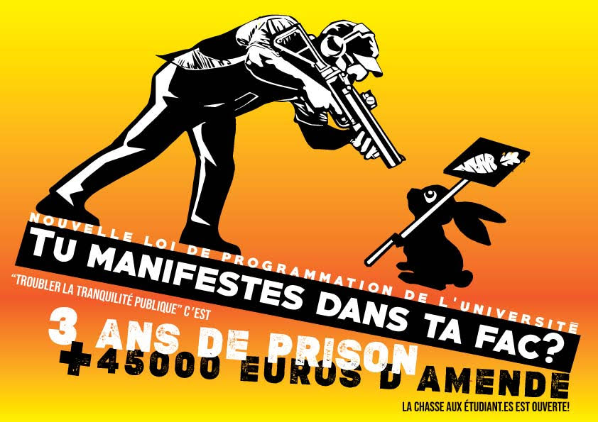 Lundi 9 novembre, la Commission mixte paritaire (CMP) a avalisé la LPR contre laquelle nous nous mobilisons depuis un an. Depuis le départ, la LPR c’est la précarisation et la privatisation de notre service public, mais c’est aussi maintenant la criminalisation de nos modes d’action. Depuis la CMP, nous savons que le texte est pire que tout ce qu’il était possible d’imaginer. Le Conseil national des universités (CNU) serait contourné dans de nombreux cas de figure pour les recrutements, alors que la qualification par le CNU est le gage de la qualité et de l’éthique des recrutements, comme du statut d’enseignant·es-chercheur·ses. Et pour couronner le tout, on nous invente un délit de “trouble à la tranquillité” des établissements, passible d’une amende de 45 000 euros et de trois ans d’emprisonnement lorsqu’il « est commis en réunion » .