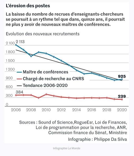 L’autre amendement qui a soulevé la colère de notre communauté c’est celui qui vient, dans les conditions procédurales que j’ai rappelées, c’est-à-dire sournoisement, mettre en péril – encore davantage que ne le faisait le projet originel – notre statut. L’amendement qui vient marginaliser le rôle du Conseil national des universités (CNU) dans le recrutement des universitaires n’a jamais été avancé auparavant, même si nous sommes conscient·es qu’il est un prolongement direct de la loi autonomie, fort contestée à son époque. Il est une atteinte majeure à notre statut. Car non seulement la LPPR vient permettre des recrutements sur contrats, pour des périodes limitées (mais comment se représente-t-on la vie d’un·e jeune chercheur·se !). Mais, à présent, des recrutements sur des postes pérennes (postes dont la chute drastique – et qu’aggravera la LPPR – est illustrée par le graphique publié hier par Le Monde), des recrutements sur des postes pérennes donc, pourront s’organiser localement, sans plus aucune qualification nationale, sans examen national indépendant de la qualité des travaux produits. La porte est ainsi ouverte à un localisme que nous dénonçons comme très dangereux pour la qualité de la recherche et sa liberté.