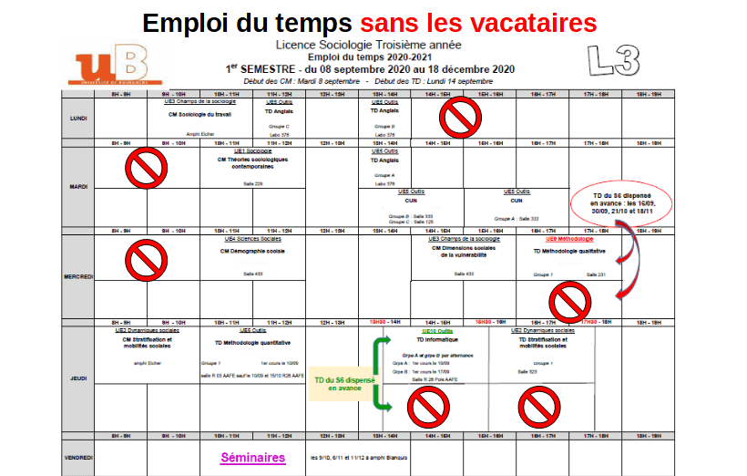 Au-delà de nos situations personnelles, bien souvent complexes, nous constatons tous les jours les difficultés de nos collègues titulaires, qui tentent de « faire tourner » l’université avec des ressources toujours plus limitées, et en faisant face aux injonctions contradictoires de l’administration, la surcharge de travail qu’induit le nombre croissant d’étudiant·es et les tâches ingrates auxquels oblige l’indigne sélection mise en place par Parcoursup ! Sans compter les charges administratives qui s’alourdissent tout particulièrement avec la situation sanitaire actuelle. Nous sommes contraint·es d’adapter les modalités d’enseignement, sans matériel et sans moyens supplémentaires, et dans des situations d’incertitude absolue sur l’évolution de la situation. Nous sommes toutes et tous au maximum de nos services et heures complémentaires et supplémentaires, à tel point que, quand l’un·e ou l’autre doit s’absenter pour quelques raisons que ce soit, nos équipes sont au bord de l’effondrement ! Et nous ne disons rien ici du sens perdu de notre travail : participer à un vrai service public de l’enseignement supérieur gratuit et ouvert à toutes et tous, systématiquement saboté par les réformes en cours du lycée et de l’ESR !