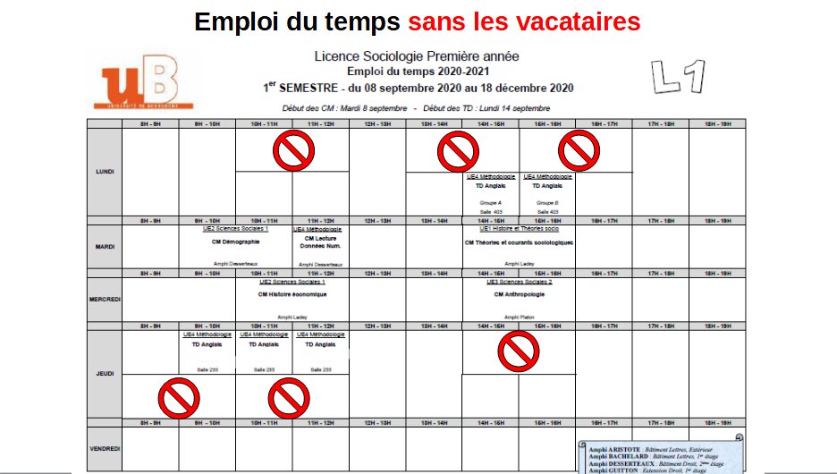 Le statut de vacataire est, à l’origine, pensé pour que des spécialistes, qui ne seraient pas enseignant·es-chercheur·ses à l’université, puissent venir effectuer quelques heures de cours dans leur domaine de spécialité. Cependant aujourd’hui ce statut est utilisé pour pallier le manque de postes, puisque sans nous, la continuité des formations ne peut être assurée : en comptant les vacations ainsi que les heures complémentaires imposées aux enseignant·es titulaires, ce sont en effet 46% des cours qui dépassent le cadre normal des enseignant·es-chercheur·ses. Nous sommes donc des rouages essentiels du fonctionnement de l’université.