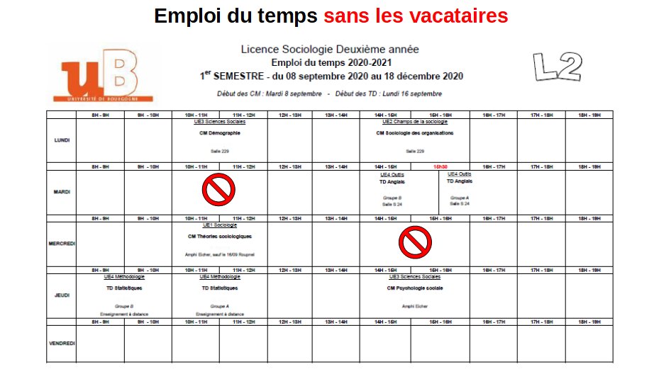 L’Université de Bourgogne, comme tant d’autres universités en France, recourt aux vacataires et aux contractuel·les pour réaliser des missions pourtant pérennes. Ainsi, en termes d’enseignement, nous vacataires, assurons en moyenne 20 % des enseignements des formations de l’Université de Bourgogne. Et au département de sociologie cette proportion grimpe à près de 30 %.