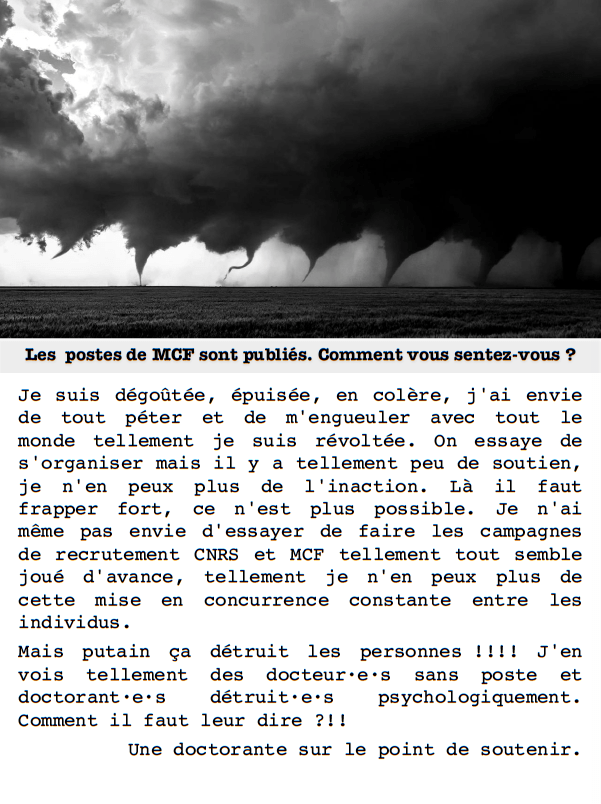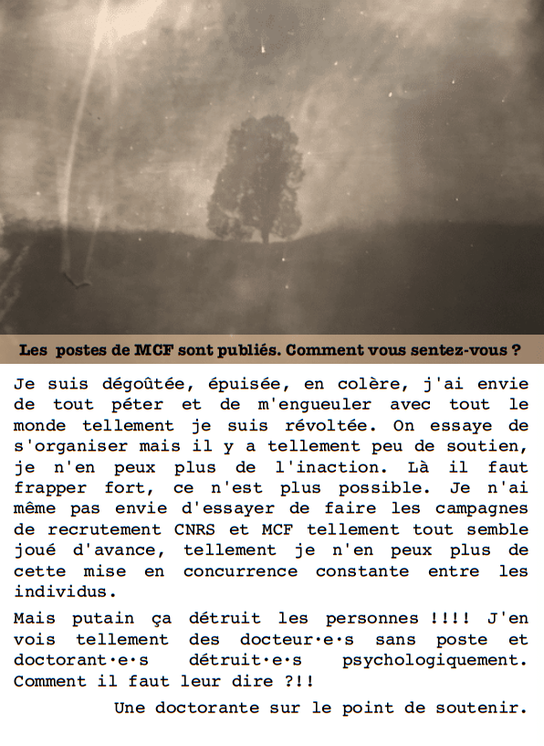 Je suis dégoûtée, épuisée, en colère, j’ai envie de tout péter et de m’engueuler avec tout le monde tellement je suis révoltée. On essaye de s’organiser mais il y a tellement peu de soutien, je n’en peux plus de l’inaction. Là il faut frapper fort, ce n’est plus possible. Je n’ai même pas envie d’essayer de faire les campagnes de recrutement CNRS et MCF tellement tout semble joué d’avance, tellement je n’en peux plus de cette mise en concurrence constante entre les individus. Mais putain ça détruit les personnes !!!! J’en vois tellement des docteur·e·s sans poste et doctorant·e·s détruit·e·s psychologiquement. Comment il faut leur dire ?!!