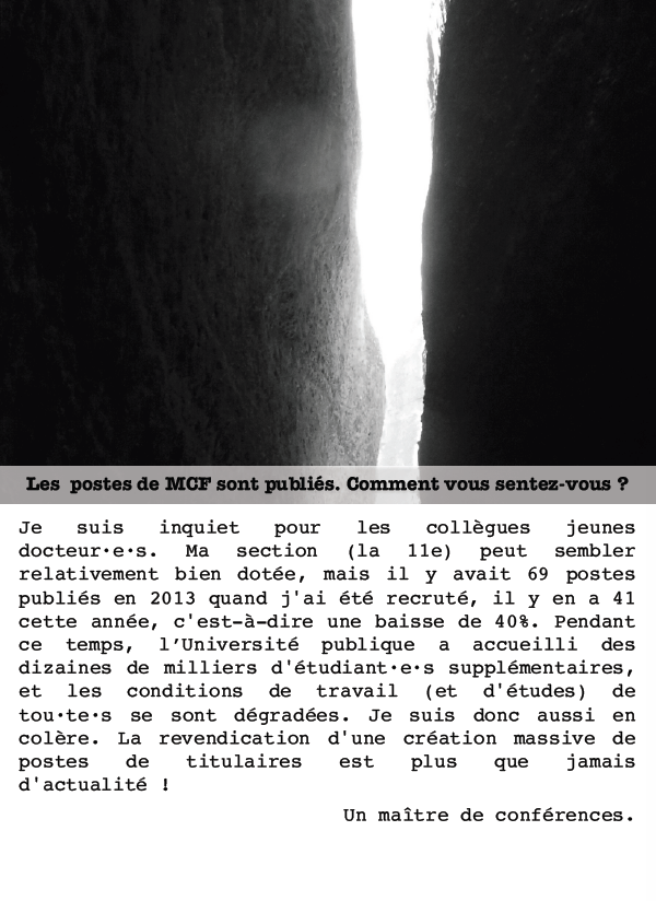 Je suis inquiet pour les collègues jeunes docteur·e·s. Ma section (la 11e) peut sembler relativement bien dotée, mais il y avait 69 postes publiés en 2013 quand j’ai été recruté, il y en a 41 cette année, c’est-à-dire une baisse de 40%. Pendant ce temps, l’Université publique a accueilli des dizaines de milliers d’étudiant·e·s supplémentaires, et les conditions de travail (et d’études) de tou·te·s se sont dégradées. Je suis donc aussi en colère. La revendication d’une création massive de postes de titulaires est plus que jamais d’actualité !