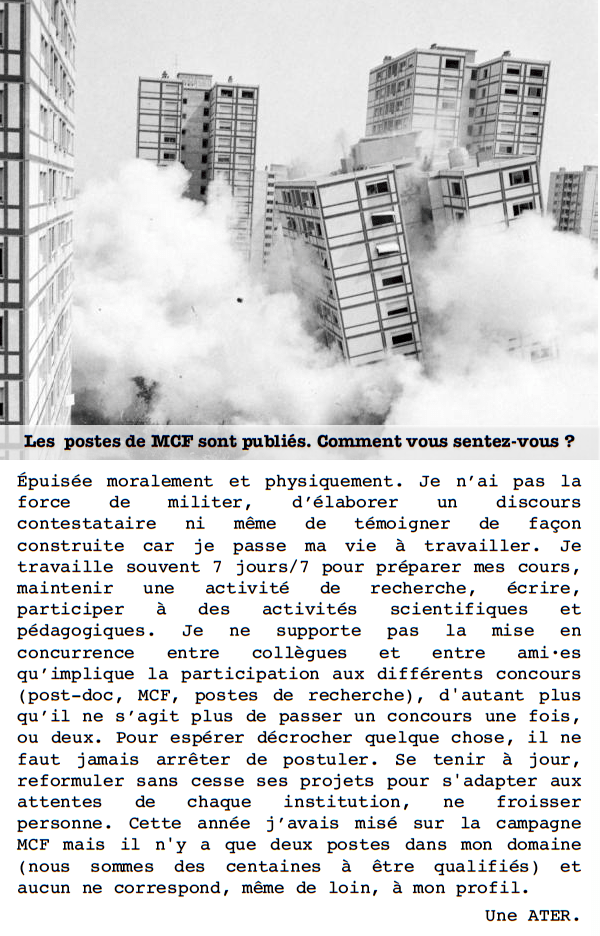 Épuisée moralement et physiquement. Je n’ai pas la force de militer, d’élaborer un discours contestataire ni même de témoigner de façon construite car je passe ma vie à travailler. Je travaille souvent 7 jours/7 pour préparer mes cours, maintenir une activité de recherche, écrire, participer à des activités scientifiques et pédagogiques. Je ne supporte pas la mise en concurrence entre collègues et entre ami·es qu’implique la participation aux différents concours (post-doc, MCF, postes de recherche), d’autant plus qu’il ne s’agit plus de passer un concours une fois, ou deux. Pour espérer décrocher quelque chose, il ne faut jamais arrêter de postuler. Se tenir à jour, reformuler sans cesse ses projets pour s’adapter aux attentes de chaque institution, ne froisser personne. Cette année j’avais misé sur la campagne MCF mais il n’y a que deux postes dans mon domaine (nous sommes des centaines à être qualifiés) et aucun ne correspond, même de loin, à mon profil.