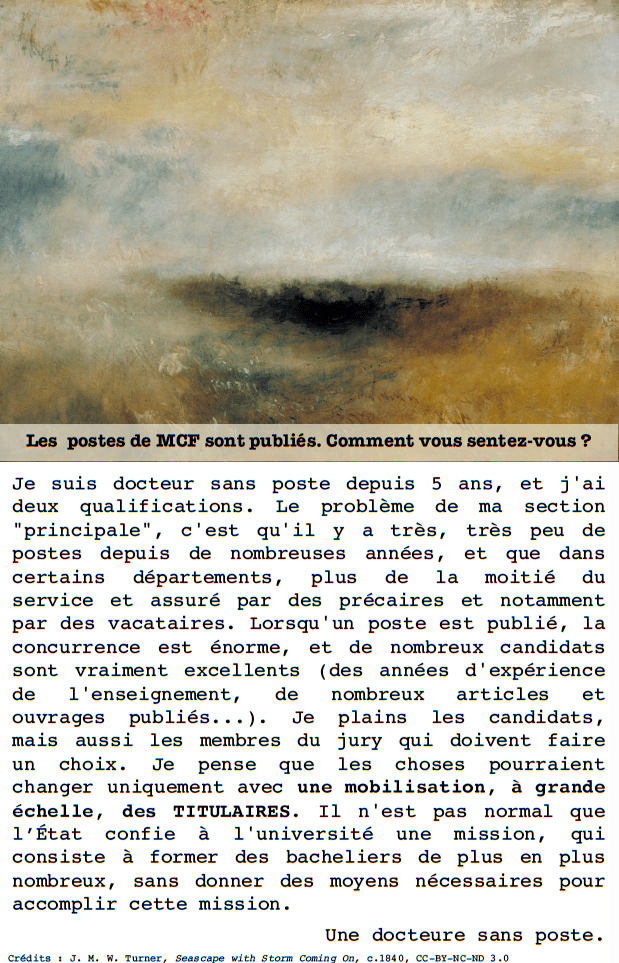 Je suis docteur sans poste depuis 5 ans, et j’ai deux qualifications. Le problème de ma section « principale », c’est qu’il y a très, très peu de postes depuis de nombreuses années, et que dans certains départements, plus de la moitié du service et assuré par des précaires et notamment par des vacataires. Lorsqu’un poste est publié, la concurrence est énorme, et de nombreux candidats sont vraiment excellents (des années d’expérience de l’enseignement, de nombreux articles et ouvrages publiés…). Je plains les candidats, mais aussi les membres du jury qui doivent faire un choix. Je pense que les choses pourraient changer uniquement avec une mobilisation, à grande échelle, des TITULAIRES. Il n’est pas normal que l’État confie à l’université une mission, qui consiste à former des bacheliers de plus en plus nombreux, sans donner des moyens nécessaires pour accomplir cette mission.