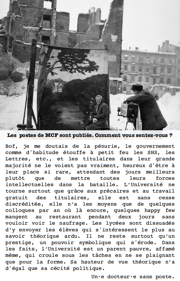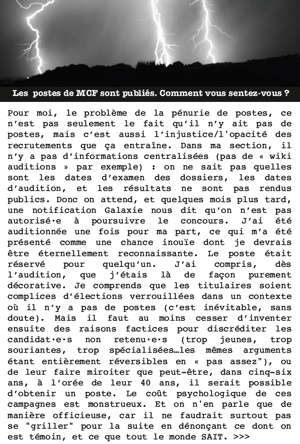 Pour moi, le problème de la pénurie de postes, ce n’est pas seulement le fait qu’il n’y ait pas de postes, mais c’est aussi l’injustice/l’opacité des recrutements que ça entraîne. Dans ma section, il n’y a pas d’informations centralisées (pas de « wiki auditions » par exemple) : on ne sait pas quelles sont les dates d’examen des dossiers, les dates d’audition, et les résultats ne sont pas rendus publics. Donc on attend, et quelques mois plus tard, une notification Galaxie nous dit qu’on n’est pas autorisé·e à poursuivre le concours. J’ai été auditionnée une fois pour ma part, ce qui m’a été présenté comme une chance inouïe dont je devrais être éternellement reconnaissante. Le poste était réservé pour quelqu’un. J’ai compris, dès l’audition, que j’étais là de façon purement décorative. Je comprends que les titulaires soient complices d’élections verrouillées dans un contexte où il n’y a pas de postes (c’est inévitable, sans doute). Mais il faut au moins cesser d’inventer ensuite des raisons factices pour discréditer les candidat·e·s non retenu·e·s (trop jeunes, trop souriantes, trop spécialisées…les mêmes arguments étant entièrement réversibles en « pas assez »), ou de leur faire miroiter que peut-être, dans cinq-six ans, à l’orée de leur 40 ans, il serait possible d’obtenir un poste. Le coût psychologique de ces campagnes est monstrueux. Et on n’en parle que de manière officieuse, car il ne faudrait surtout pas se « griller » pour la suite en dénonçant ce dont on est témoin, et ce que tout le monde SAIT. Dans ma section, je ne compte pas le nombre de récits en coulisses qui portent sur des élections jouées d’avance et sur des auditions humiliantes. Les titulaires sont les premiers à les véhiculer, jusqu’au moment où ils contribuent, à leur tour, à faire la même chose. Donc quand je vois les postes sur Galaxie cette année, au moment de créer mon dossier, je m’interroge : sera-t-il renvoyé au néant par une notification automatique, ou aurai-je la chance de faire de la figuration dans une parodie d’audition ? Ou certains postes, cette année, proches de mon profil, sont-ils ouverts « pour de vrai » ? Il est certain que la diminution des postes est une diminution non seulement de la possibilité d’en obtenir un, mais de la possibilité d’être auditionné·e de façon « juste » et respectueuse (je mets « juste » entre guillemets, car quelle justice peut-il y avoir quand on peut candidater sur trois postes à tout casser sur l’ensemble de la France et qu’il y a une centaine de dossiers pour chaque poste, des centaines de docteur·e·s qui attendent depuis des années ?).