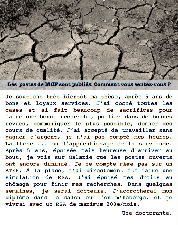 Je soutiens très bientôt ma thèse, après 5 ans de bons et loyaux services. J’ai coché toutes les cases et ai fait beaucoup de sacrifices pour faire une bonne recherche : publier dans de bonnes revues, communiquer le plus possible, donner des cours de qualité. J’ai accepté de travailler sans gagner d’argent, je n’ai pas compté mes heures. La thèse … ou l’apprentissage de la servitude. Après 5 ans, épuisée mais heureuse d’arriver au bout, je vois sur Galaxie que les postes ouverts ont encore diminué. Je ne compte même pas sur un ATER. À la place, j’ai directement été faire une simulation de RSA. J’ai épuisé mes droits au chômage pour finir mes recherches. Dans quelques semaines, je serai docteure. J’accrocherai mon diplôme dans le salon où l’on m’héberge, et je vivrai avec un RSA de maximum 200e/mois.