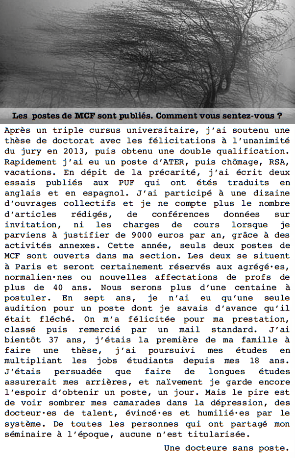 Après un triple cursus universitaire, j’ai soutenu une thèse de doctorat avec les félicitations à l’unanimité du jury en 2013, puis obtenu une double qualification. Rapidement j’ai eu un poste d’ATER, puis chômage, RSA, vacations. En dépit de la précarité, j’ai écrit deux essais publiés aux PUF qui ont étés traduits en anglais et en espagnol. J’ai participé à une dizaine d’ouvrages collectifs et je ne compte plus le nombre d’articles rédigés, de conférences données sur invitation, ni les charges de cours lorsque je parviens à justifier de 9000 euros par an, grâce à des activités annexes. Cette année, seuls deux postes de MCF sont ouverts dans ma section. Les deux se situent à Paris et seront certainement réservés aux agrégé·es, normalien·nes ou nouvelles affectations de profs de plus de 40 ans. Nous serons plus d’une centaine à postuler. En sept ans, je n’ai eu qu’une seule audition pour un poste dont je savais d’avance qu’il était fléché. On m’a félicitée pour ma prestation, classé puis remercié par un mail standard. J’ai bientôt 37 ans, j’étais la première de ma famille à faire une thèse, j’ai poursuivi mes études en multipliant les jobs étudiants depuis mes 18 ans. J’étais persuadée que faire de longues études assurerait mes arrières, et naïvement je garde encore l’espoir d’obtenir un poste, un jour. Mais le pire est de voir sombrer mes camarades dans la dépression, des docteur·es de talent, évincé·es et humilié·es par le système. De toutes les personnes qui ont partagé mon séminaire à l’époque, aucune n’est titularisée.