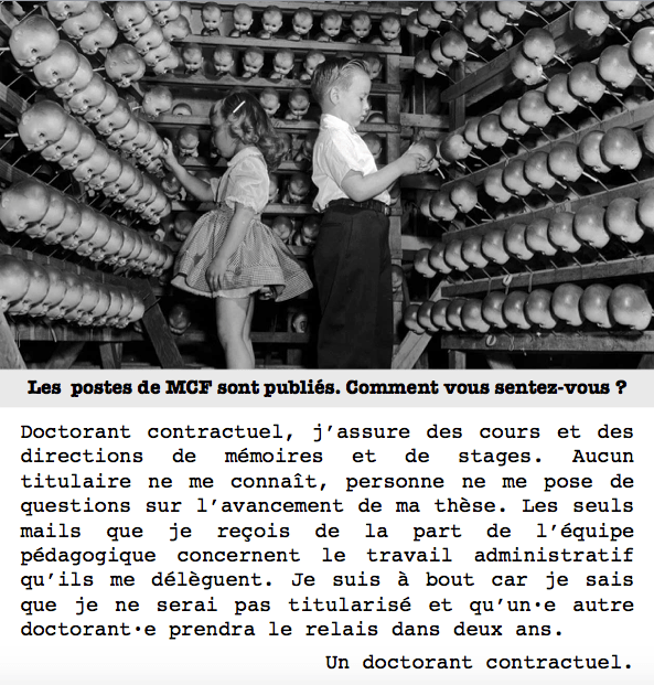 Doctorant contractuel, j’assure des cours et des directions de mémoires et de stages. Aucun titulaire ne me connaît, personne ne me pose de questions sur l’avancement de ma thèse. Les seuls mails que je reçois de la part de l’équipe pédagogique concerne le travail administratif qu’ils me délèguent. Je suis à bout car je sais que je ne serai pas titularisé et qu’un·e autre doctorant·e prendra le relais dans deux ans.