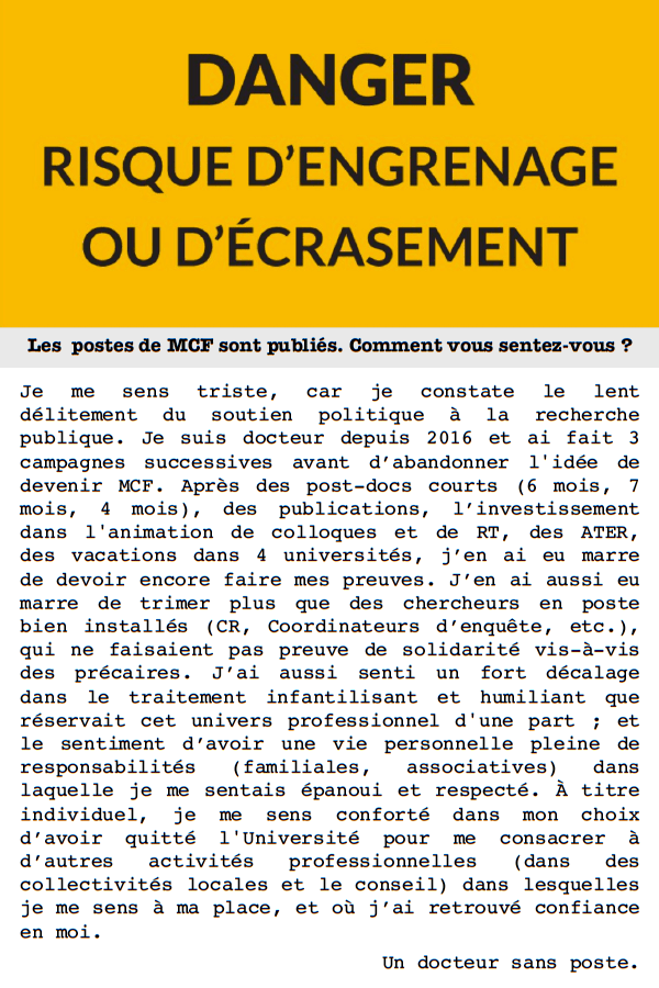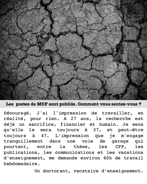 Écœuré encore davantage, je suis docteur depuis 2015. Entre ma première campagne (en 2016) et aujourd’hui, le nombre de postes auquel je peux candidater a été divisé par deux. J’ai la haine contre ce gouvernement alors que le besoin d’encadrement des étudiants est au maximum et que les collègues titulaires au bord du burn-out. J’ai publié deux ouvrages, une dizaine d’articles, une dizaines de chapitres d’ouvrage mais avant même de déposer le moindre dossier, je sens très bien que je n’aurai encore aucun poste cette année et que je resterai au RSA à cause des restrictions budgétaires de ceux qui nous gouvernent.