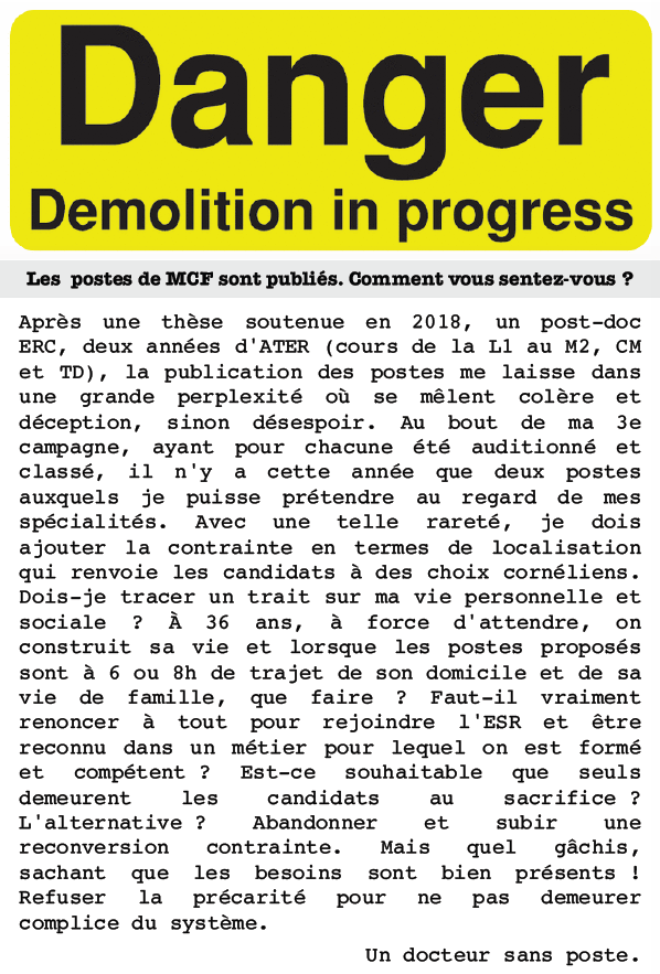 Après une thèse soutenue en 2018, un post-doc ERC, deux années d’ATER (cours de la L1 au M2, CM et TD), la publication des postes me laisse dans une grande perplexité où se mêlent colère et déception, sinon désespoir. Au bout de ma 3e campagne, ayant pour chacune été auditionné et classé, il n’y a cette année que deux postes auxquels je puisse prétendre au regard de mes spécialités. Avec une telle rareté, je dois ajouter la contrainte en termes de localisation qui renvoie les candidats à des choix cornéliens. Dois-je tracer un trait sur ma vie personnelle et sociale ? À 36 ans, à force d’attendre, on construit sa vie et lorsque les postes proposés sont à 6 ou 8h de trajet de son domicile et de sa vie de famille, que faire ? Faut-il vraiment renoncer à tout pour rejoindre l’ESR et être reconnu dans un métier pour lequel on est formé et compétent ? Est-ce souhaitable que seuls demeurent les candidats au sacrifice ? L’alternative ? Abandonner et subir une reconversion contrainte. Mais quel gâchis, sachant que les besoins sont bien présents ! Refuser la précarité pour ne pas demeurer complice du système.