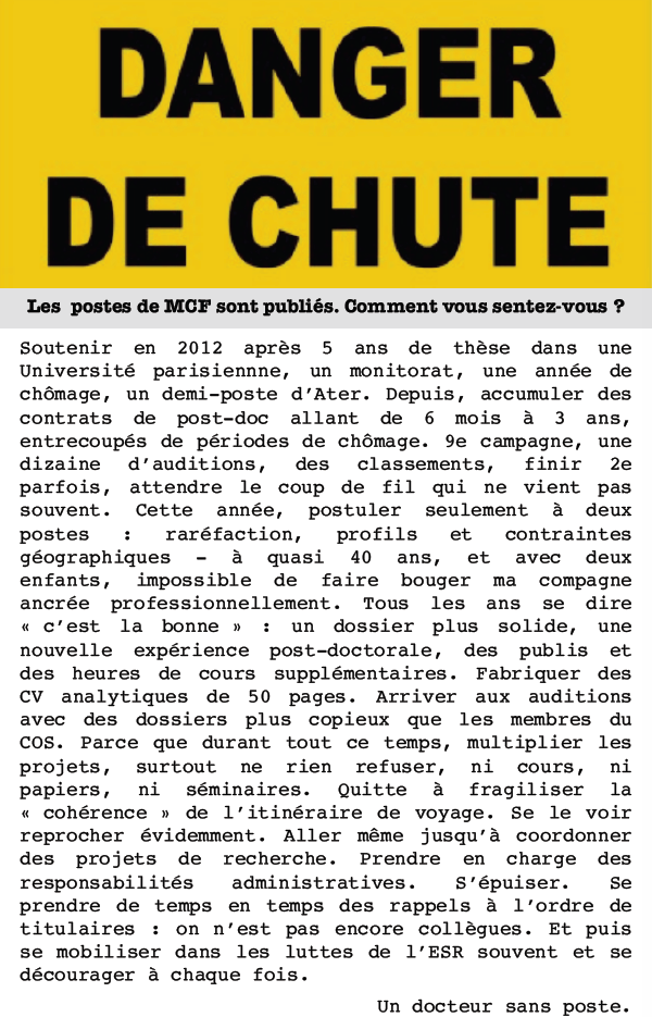 Soutenir en 2012 après 5 ans de thèse dans une Université parisiennne, un monitorat, une année de chômage, un demi-poste d’Ater. Depuis, accumuler des contrats de post-doc allant de 6 mois à 3 ans, entrecoupés de périodes de chômage. 9e campagne, une dizaine d’auditions, des classements, finir 2e parfois, attendre le coup de fil qui ne vient pas souvent. Cette année, postuler seulement à deux postes : raréfaction, profils et contraintes géographiques – à quasi 40 ans, et avec deux enfants, impossible de faire bouger ma compagne ancrée professionnellement. Tous les ans se dire « c’est la bonne » : un dossier plus solide, une nouvelle expérience post-doctorale, des publis et des heures de cours supplémentaires. Fabriquer des CV analytiques de 50 pages. Arriver aux auditions avec des dossiers plus copieux que les membres du COS. Parce que durant tout ce temps, multiplier les projets, surtout ne rien refuser, ni cours, ni papiers, ni séminaires. Quitte à fragiliser la « cohérence » de l’itinéraire de voyage. Se le voir reprocher évidemment. Aller même jusqu’à coordonner des projets de recherche. Prendre en charge des responsabilités administratives. S’épuiser. Se prendre de temps en temps des rappels à l’ordre de titulaires : on n’est pas encore collègues. Et puis se mobiliser dans les luttes de l’ESR souvent et se décourager à chaque fois.