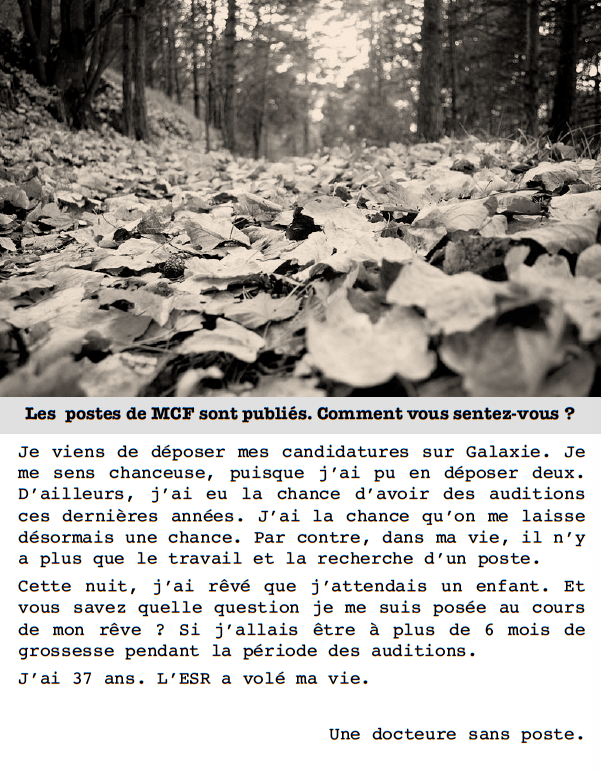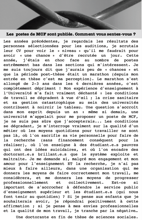 Les années précédentes, je regardais les résultats des personnes sélectionnées pour les auditions, je scrutais leur CV pour voir le « niveau » qu’il me faudrait pour avoir « une chance » d’être recrutée un jour. Cette année, j’étais en choc face au nombre de postes extrêmement bas dans les sections qui m’intéressent. Je me suis toujours dit que j’aurais peu de « chances » et que la période post-thèse était un marathon (depuis mon entrée en thèse c’est ma perception). Le marathon s’est allongé de 2-3 ans dans les 6 dernières années, c’est complètement déprimant ! Mon expérience d’enseignement à l’Université m’a fait vraiment déchanté : les conditions de travail se dégradent à vue d’œil ; la crise sanitaire et sa gestion catastrophique au sein des universités contribuent à noircir le tableau. Une question s’accroît dans mon esprit depuis un an : même si demain, une université m’appelait pour me proposer un poste de MCF, je ne suis pas sûre que j’accepterais… Les conditions se dégradant, je m’interroge vraiment sur la qualité d’un métier où les moyens quotidiens pour travailler ne sont pas là, où l’on sacrifie sa vie personnelle pour faire de la recherche (sans financement conséquent pour la réaliser), où l’on enseigne à des étudiant.e.s pauvres qui ont des idées suicidaires, et où l’on encadre des doctorant.e.s brillant.e.s que le système exploite et maltraite. Je me demande si, malgré mon engagement et mon amour pour l’enseignement ET la recherche, je n’ai pas mieux à faire ailleurs, dans une organisation qui me donnera les moyens de faire correctement mon travail, me considèrera, et me donnera les moyens de progresser professionnellement et collectivement. Est-ce si important de s’accrocher à défendre le service public d’enseignement supérieur et les étudiant.e.s (qui nous font tenir au quotidien) ? Si je pense aux enfants que je souhaiterais avoir, je répondrai positivement à cette affirmation ; si je pense à mes envies professionnelles et la qualité de mon travail, je tranche par la négative…