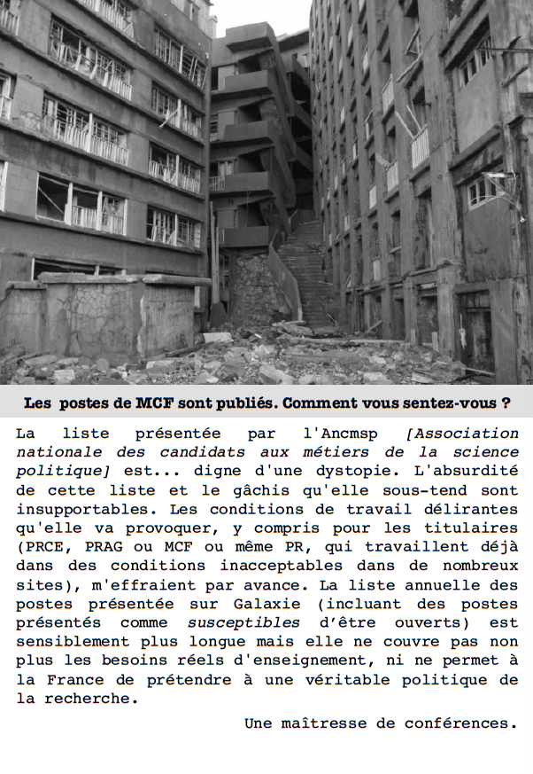 La liste présentée par l’Ancmsp [Association nationale des candidats aux métiers de la science politique] est… digne d’une dystopie. L’absurdité de cette liste et le gâchis qu’elle sous-tend sont insupportables. Les conditions de travail délirantes qu’elle va provoquer, y compris pour les titulaires (PRCE, PRAG ou MCF ou même PR, qui travaillent déjà dans des conditions inacceptables dans de nombreux sites), m’effraient par avance. La liste annuelle des postes présentée sur Galaxie (incluant des postes présentés comme susceptibles d’être ouverts) est sensiblement plus longue mais elle ne couvre pas non plus les besoins réels d’enseignement, ni ne permet à la France de prétendre à une véritable politique de la recherche.