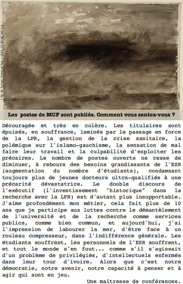 Découragée et très en colère. Les titulaires sont épuisés, en souffrance, laminés par le passage en force de la LPR, la gestion de la crise sanitaire, la polémique sur l’islamo-gauchisme, la sensation de mal faire leur travail et la culpabilité d’exploiter les précaires. Le nombre de postes ouverts ne cesse de diminuer, à rebours des besoins grandissants de l’ESR (augmentation du nombre d’étudiants), condamnant toujours plus de jeunes docteurs ultra-qualifiés à une précarité dévastatrice. Le double discours de l’exécutif (l’investissement « historique » dans la recherche avec la LPR) est d’autant plus insupportable. J’aime profondément mon métier, cela fait plus de 10 ans que je participe aux luttes contre le démantèlement de l’université et de la recherche comme services publics, comme bien commun, et aujourd’hui, j’ai l’impression de labourer la mer, d’être face à un rouleau compresseur, dans l’indifférence générale. Les étudiants souffrent, les personnels de l’ESR souffrent, et tout le monde s’en fout… comme s’il s’agissait d’un problème de privilégiés, d’intellectuels enfermés dans leur tour d’ivoire. Alors que c’est notre démocratie, notre avenir, notre capacité à penser et à agir qui sont en jeu.