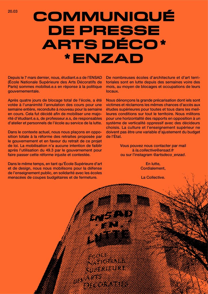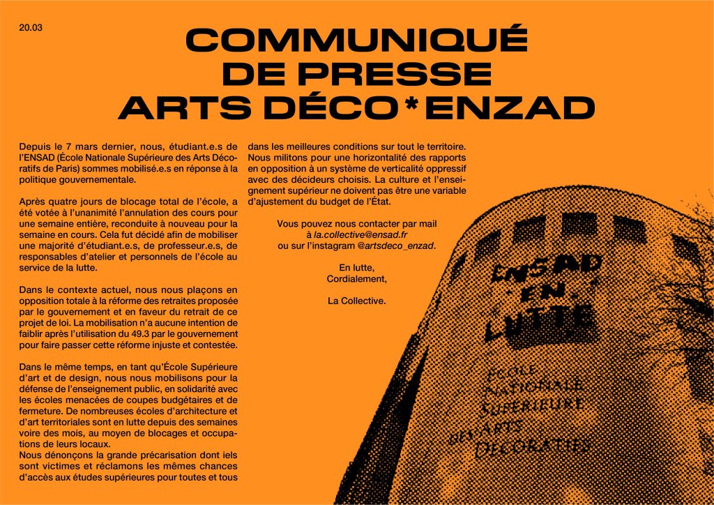 Depuis le 7 mars dernier, nous, étudiant·es de l’ENSAD (École Nationale Supérieure des Arts Décoratifs de Paris) sommes mobilisé·es en réponse à la politique gouvernementale.